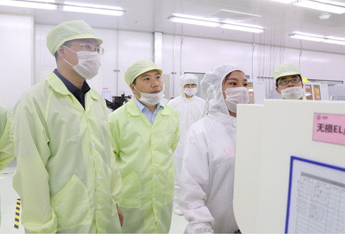 隨后,考察組一行參觀了生產(chǎn)車間,重點(diǎn)觀摩了芯片工藝流程和點(diǎn)測工藝,對(duì)現(xiàn)代化的生產(chǎn)技術(shù)頻頻稱贊。得知外延生產(chǎn)車間中運(yùn)作良好的MOCVD設(shè)備均為南昌當(dāng)?shù)仄髽I(yè)生產(chǎn)制造時(shí),盛煒書記對(duì)乾照光電對(duì)南昌光電產(chǎn)業(yè)發(fā)展的支持表示了贊許。