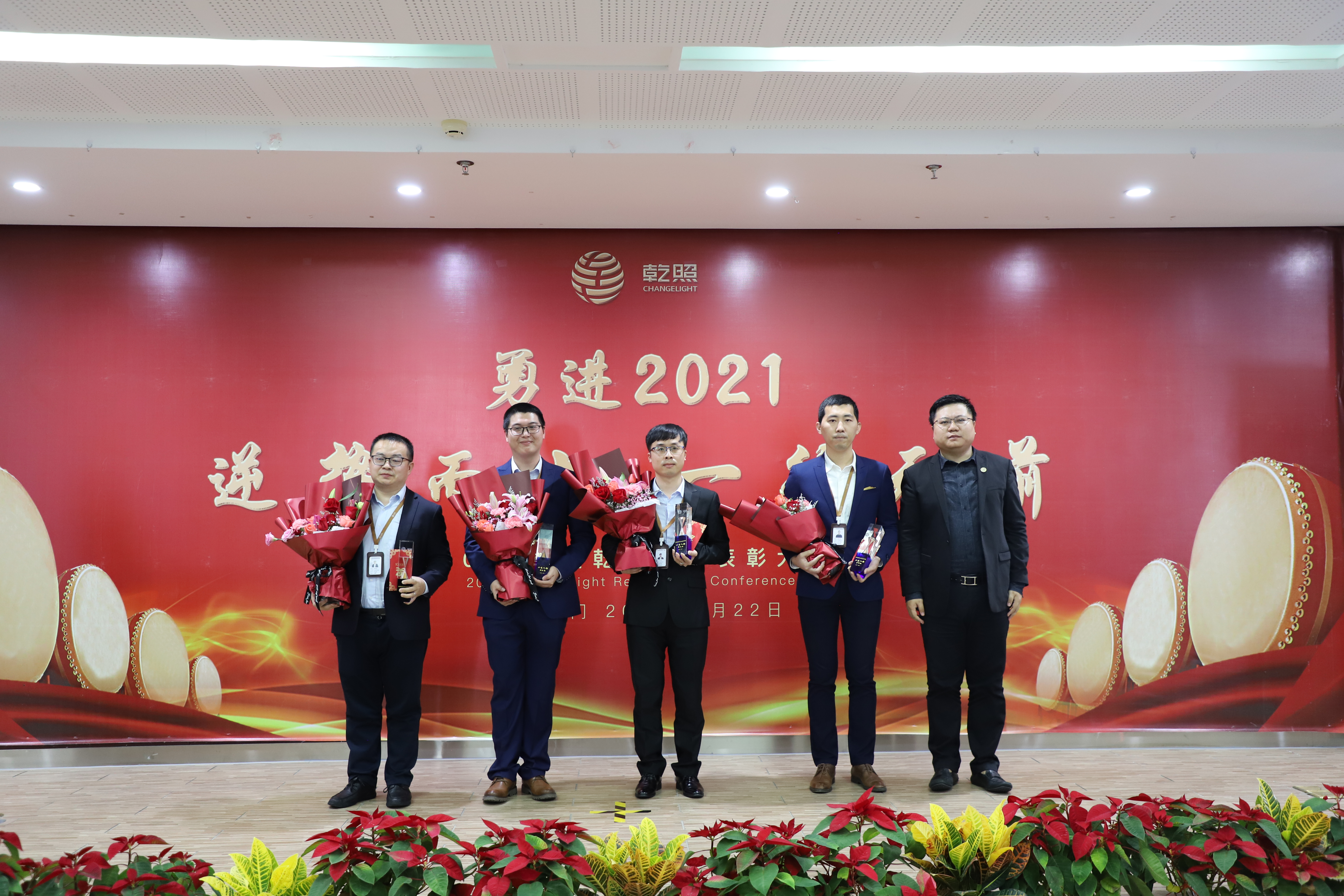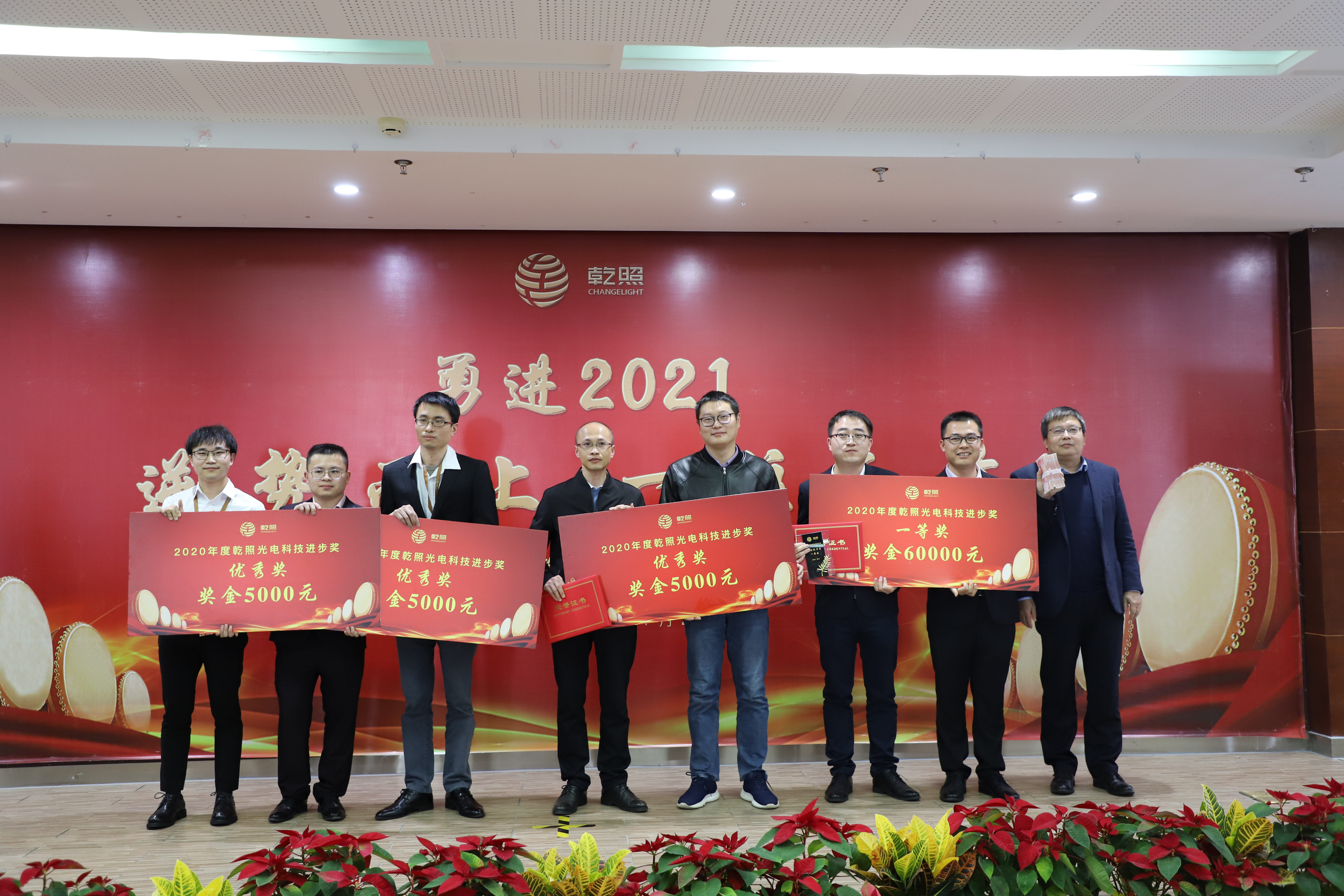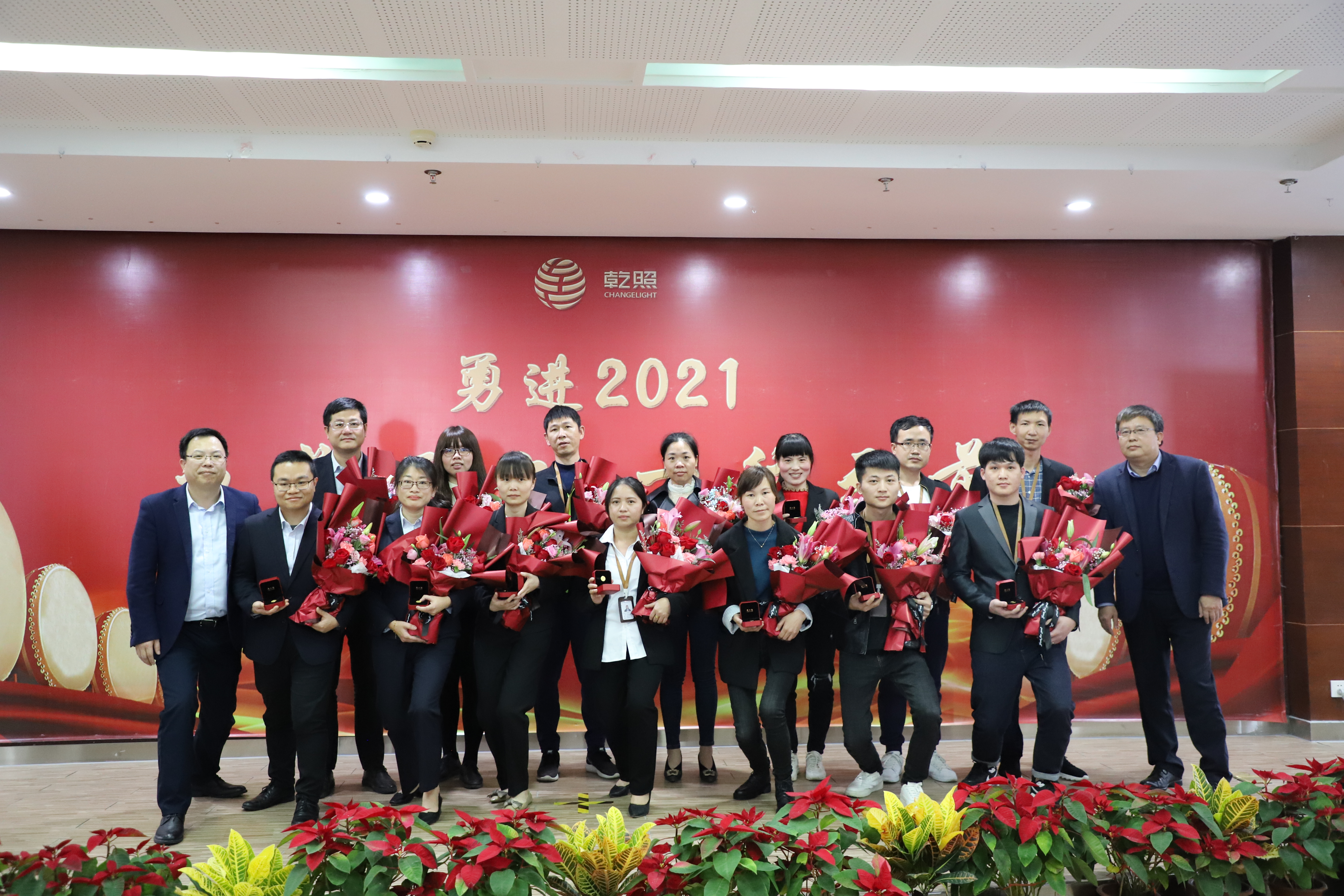 總結(jié)報告后,公司對2020年工作中表現(xiàn)突出的個人和團隊進行了表彰。此次表彰共設(shè)置了最佳新人獎、基層骨干獎,技術(shù)精英獎、管理卓越獎、優(yōu)秀部門獎、優(yōu)秀班組獎、科技進步獎、十年員工、安全評優(yōu)、黨支部優(yōu)秀黨員獎、“乾照十佳人物”等多類獎項。金章育為十佳人物一一頒獎,蔡海防為十年員工頒發(fā)十年紀念金幣。