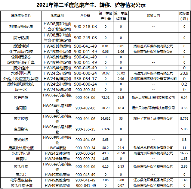 揚州乾照光電有限公司2021年第二季度危廢產生、轉移、貯存情況公示