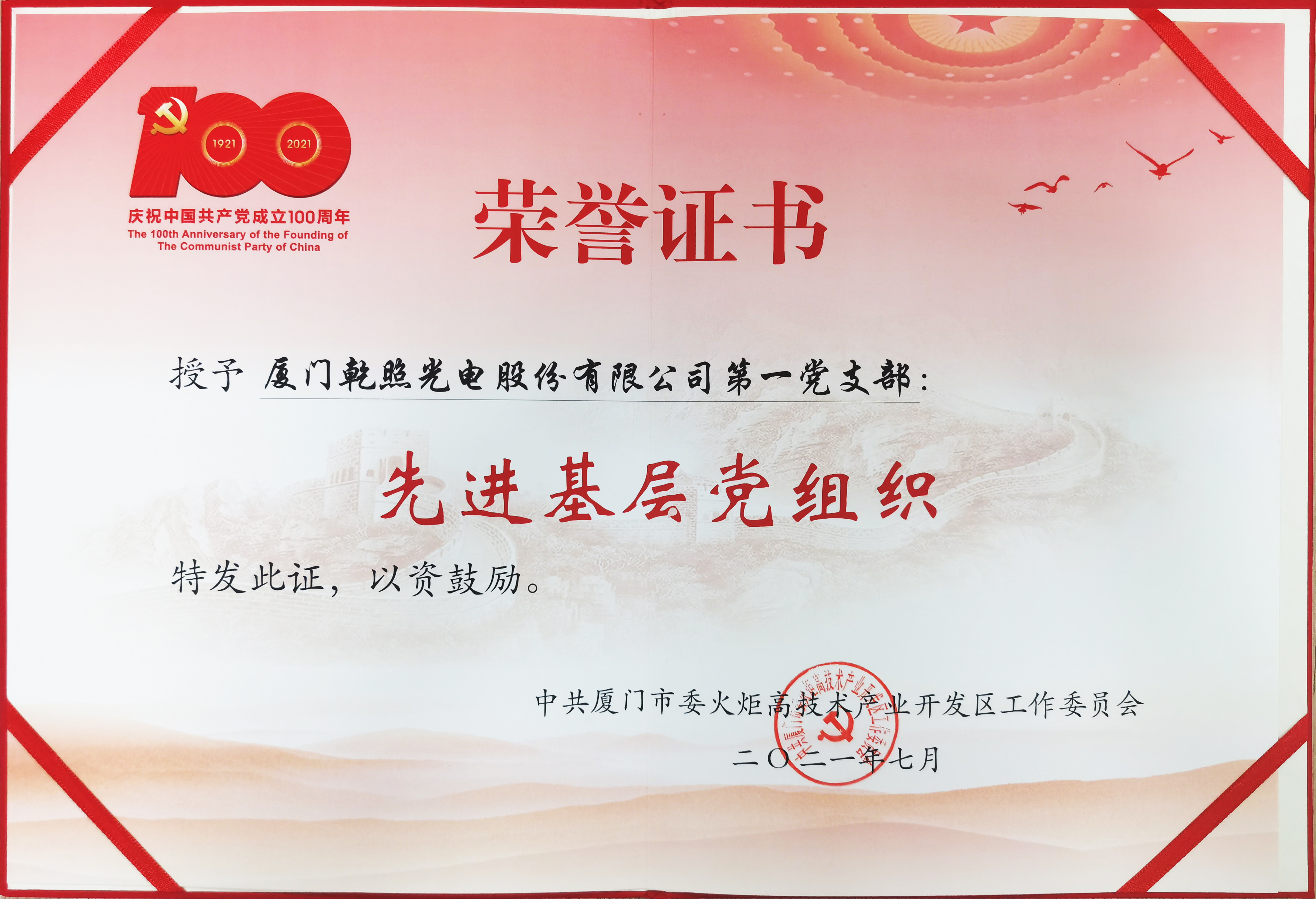 廈門(mén)乾照光電第一黨支部榮獲“先進(jìn)基層黨組織”稱號(hào)