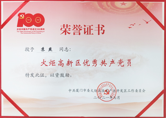 廈門(mén)乾照光電蘇燕榮獲“火炬高新區(qū)優(yōu)秀共產(chǎn)黨員”稱號(hào)