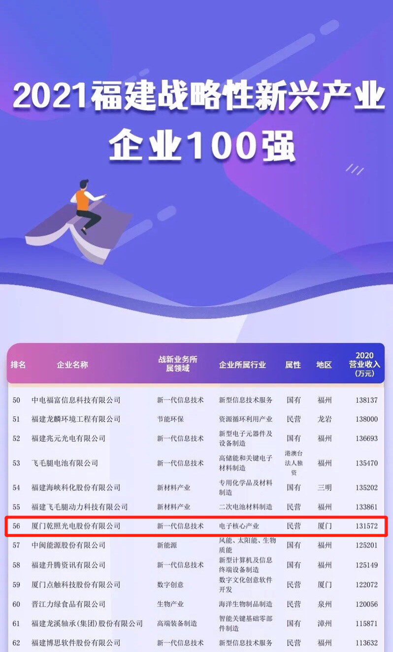 本次福建企業(yè)百強評選依照中國企業(yè)聯(lián)合會研究發(fā)布“中國企業(yè)500強”的做法要求,以2020年企業(yè)營業(yè)收入為基本標準,綜合參考企業(yè)的其他經(jīng)營指標,經(jīng)評審委員會審定,廈門乾照光電股份有限公司以2020年營業(yè)收入131572萬元,入選 “2021福建戰(zhàn)略性新興產(chǎn)業(yè)企業(yè)100強”。