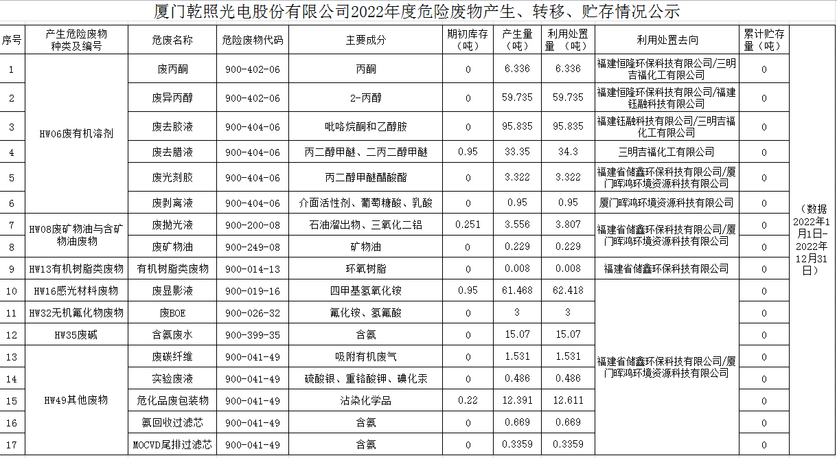 廈門乾照光電股份有限公司2022年度危險廢物產(chǎn)生、轉(zhuǎn)移、貯存情況公示