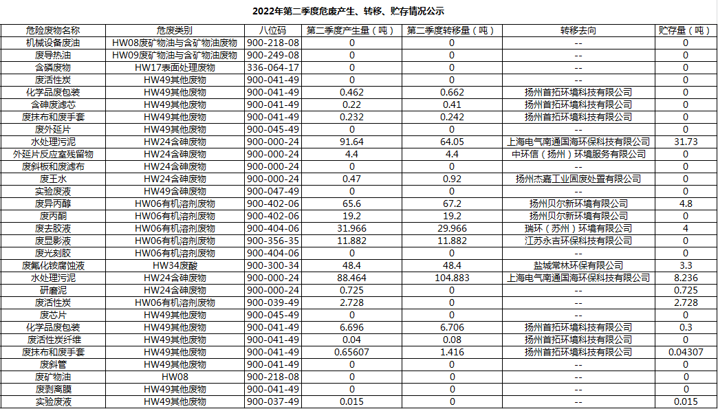 揚(yáng)州乾照光電有限公司2022年第二季度危廢產(chǎn)生、轉(zhuǎn)移、貯存情況公示