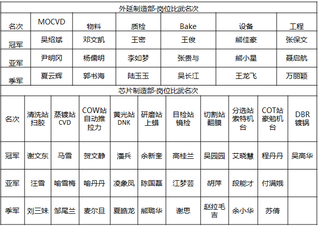 外延崗前比武項(xiàng)目涉及機(jī)臺(tái)組取放片、質(zhì)檢組鐳刻+測(cè)試、物料組發(fā)料PVD操作、Bake組烤爐、工程組硬件、控制率,設(shè)備組球閥、過濾器清理等項(xiàng)目。芯片技能比賽項(xiàng)目包括清洗站掃膠、蒸鍍站CVD、COW站自動(dòng)推拉力、黃光站DNK、研磨站上蠟、目檢站鏡檢、切割站翻膜、分選站索特機(jī)臺(tái)、COT站豪勉機(jī)臺(tái)、DBR鍍鍋等。經(jīng)過多輪比拼,最終46位選手脫穎而出,榮獲各項(xiàng)冠亞季軍。